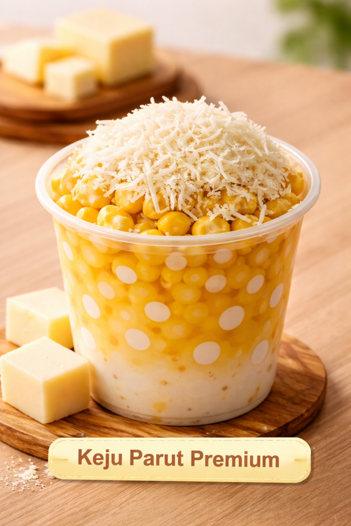 Keju parut premium dipilih dari bahan berkualitas tinggi dengan cita rasa gurih yang lembut dan tidak terlalu asin. Saat dipadukan dengan jagung manis yang masih hangat, keju akan sedikit meleleh dan menyatu sempurna dengan susu, menciptakan tekstur creamy yang halus.